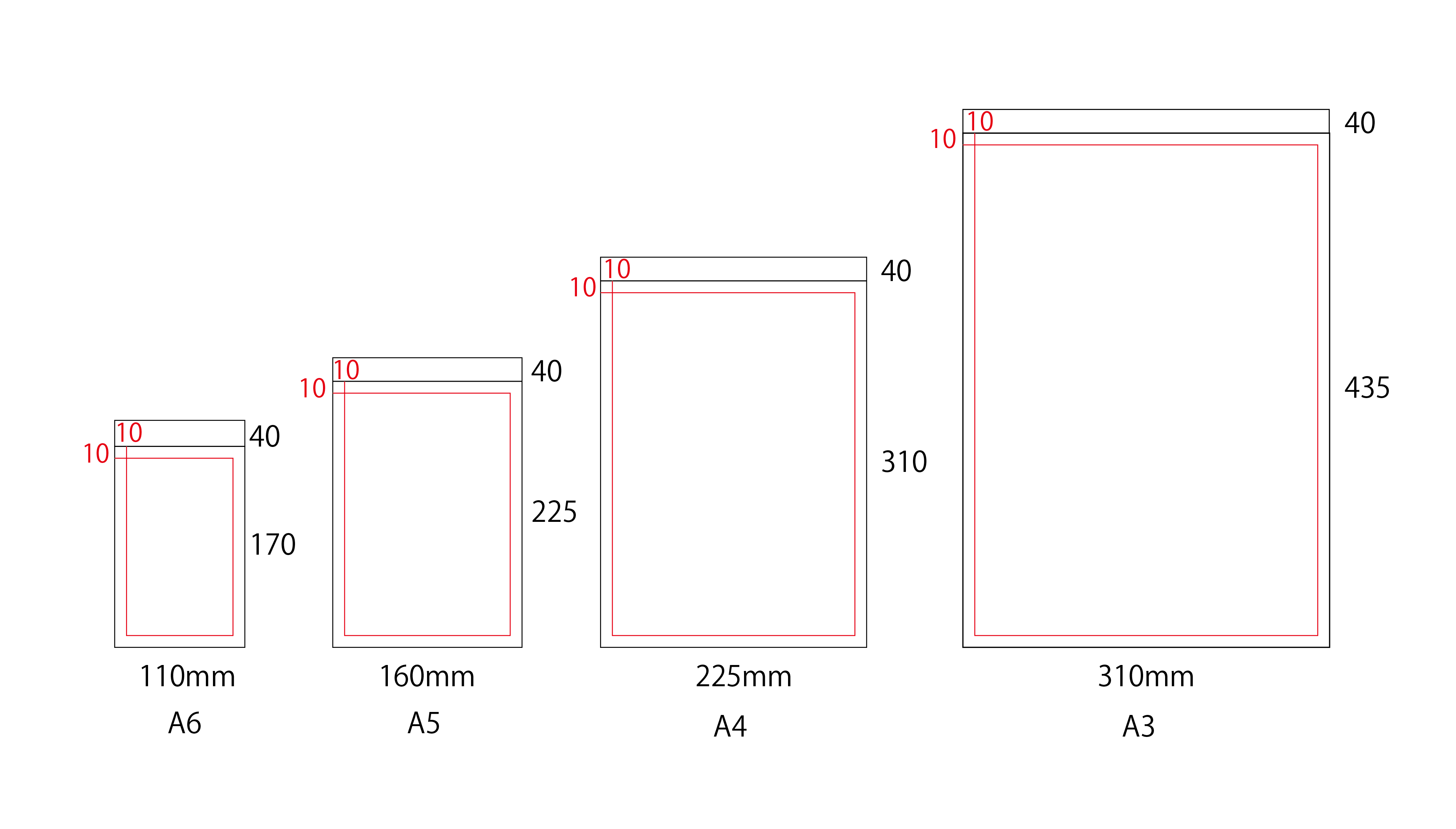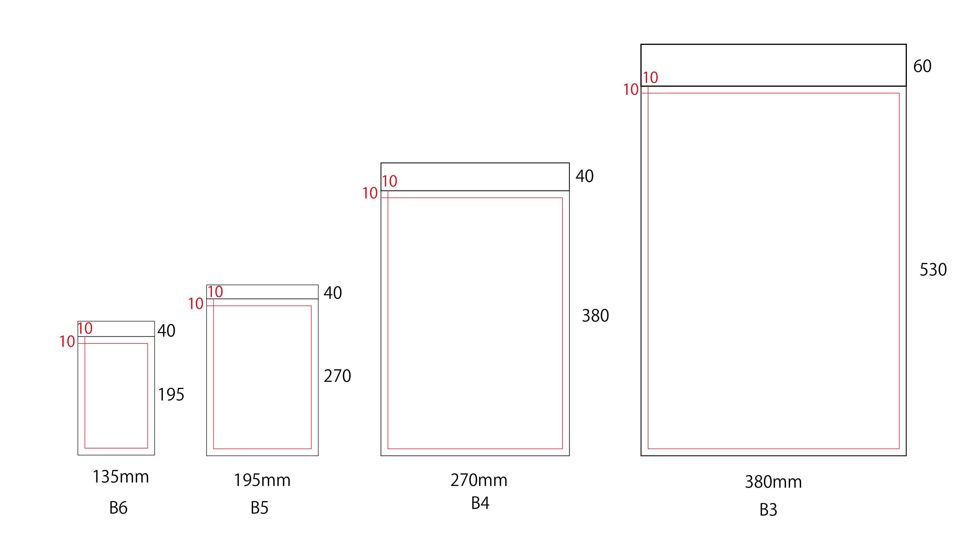 テープありの場合は上記+40mm(B3の場合60mm)のフタがつきます。
